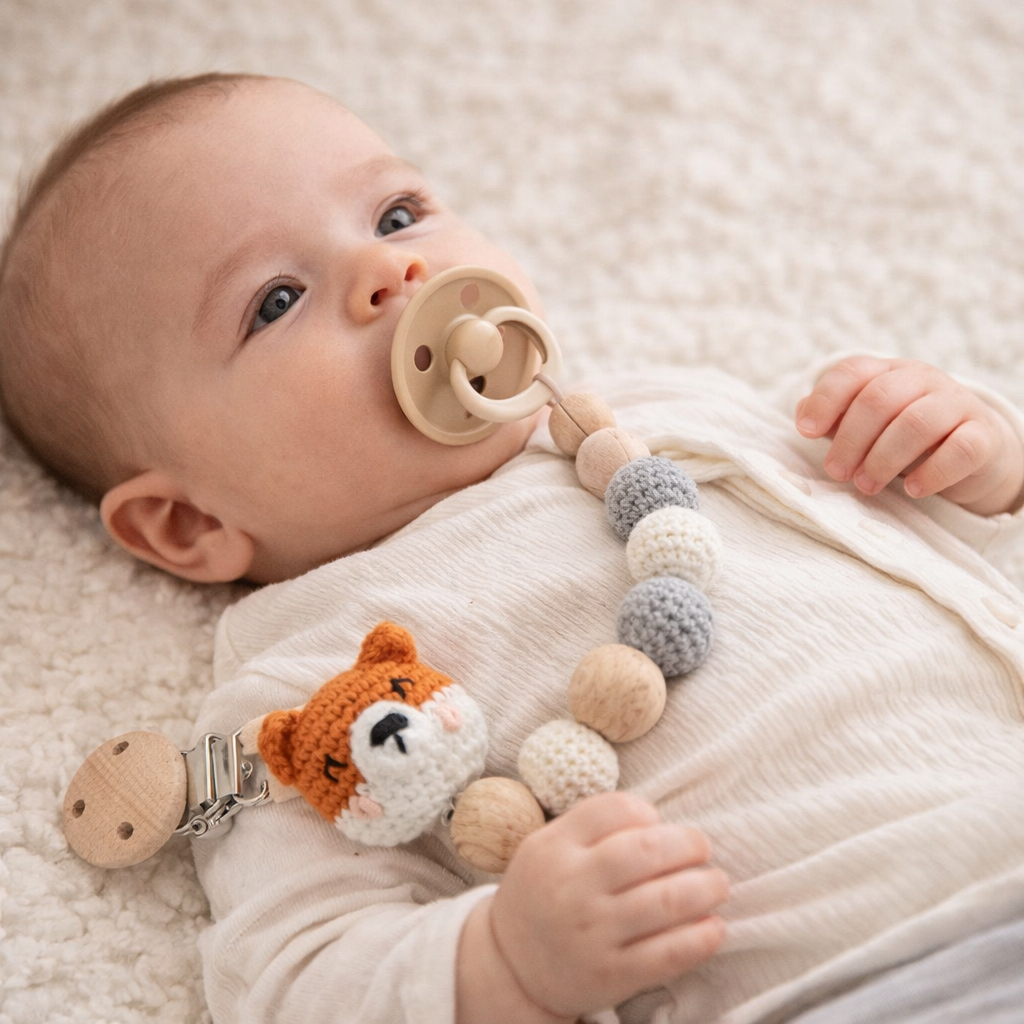 Les moments précieux avec bébé méritent des accessoires aussi mignons que fonctionnels. Notre attache sucette en forme d'animal, fabriquée à la main en coton et bois de hêtre, devient rapidement l'accessoire indispensable que tous les parents nous envient. Comment garder la tétine de votre enfant propre et toujours à portée de main ? La réponse est sous vos yeux !